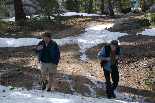 With this last patch of snow behind us, we were now able to drive quite a distance towards the site. Eventually, as we had figured, we reached the snow line near the top and had to hike the last mile of road on foot. This would have been a nice afternoon hike...except for the mosquitos!! Swarms of mosquitos followed us every step of the way. And the person voted most likely to catch "west nile"... our very own N6- "Shorts" -MVT.